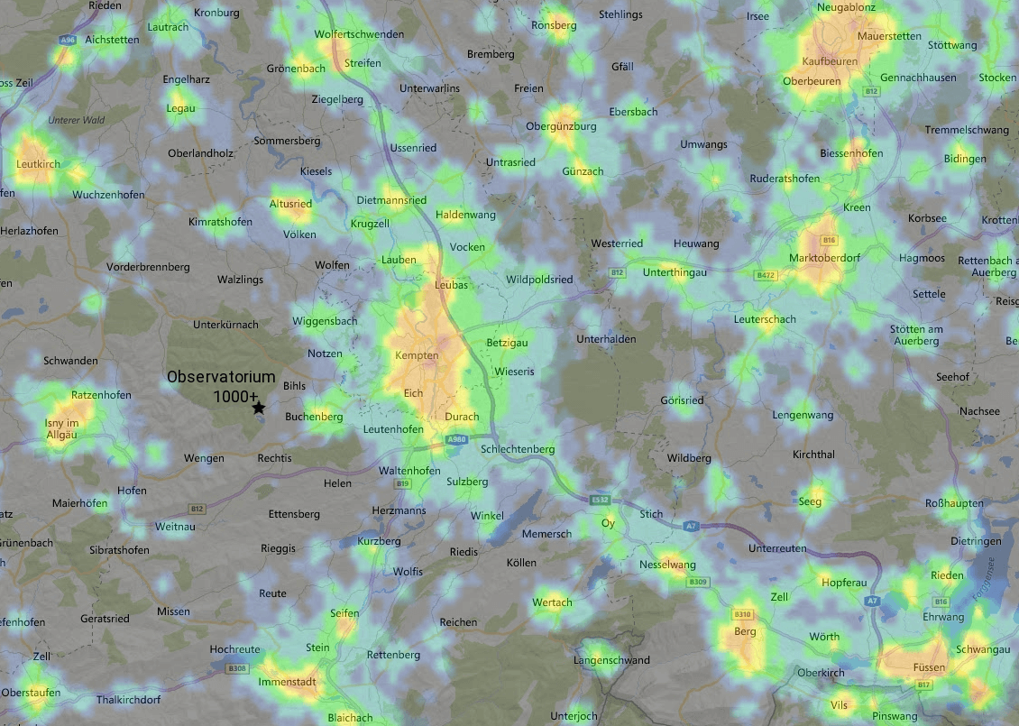 Der Standort für das Observatorium 1000+ liegt 9 Kilometer westlich von Kempten, am Parkplatz Eschacher Weiher in der Gemeinde Buchenberg. Dort haben wir ein Grundstück von knapp 500 m² erworben. Dieser Platz zeichnet sich durch hervorragende Bedingungen für den Betrieb einer Sternwarte aus.